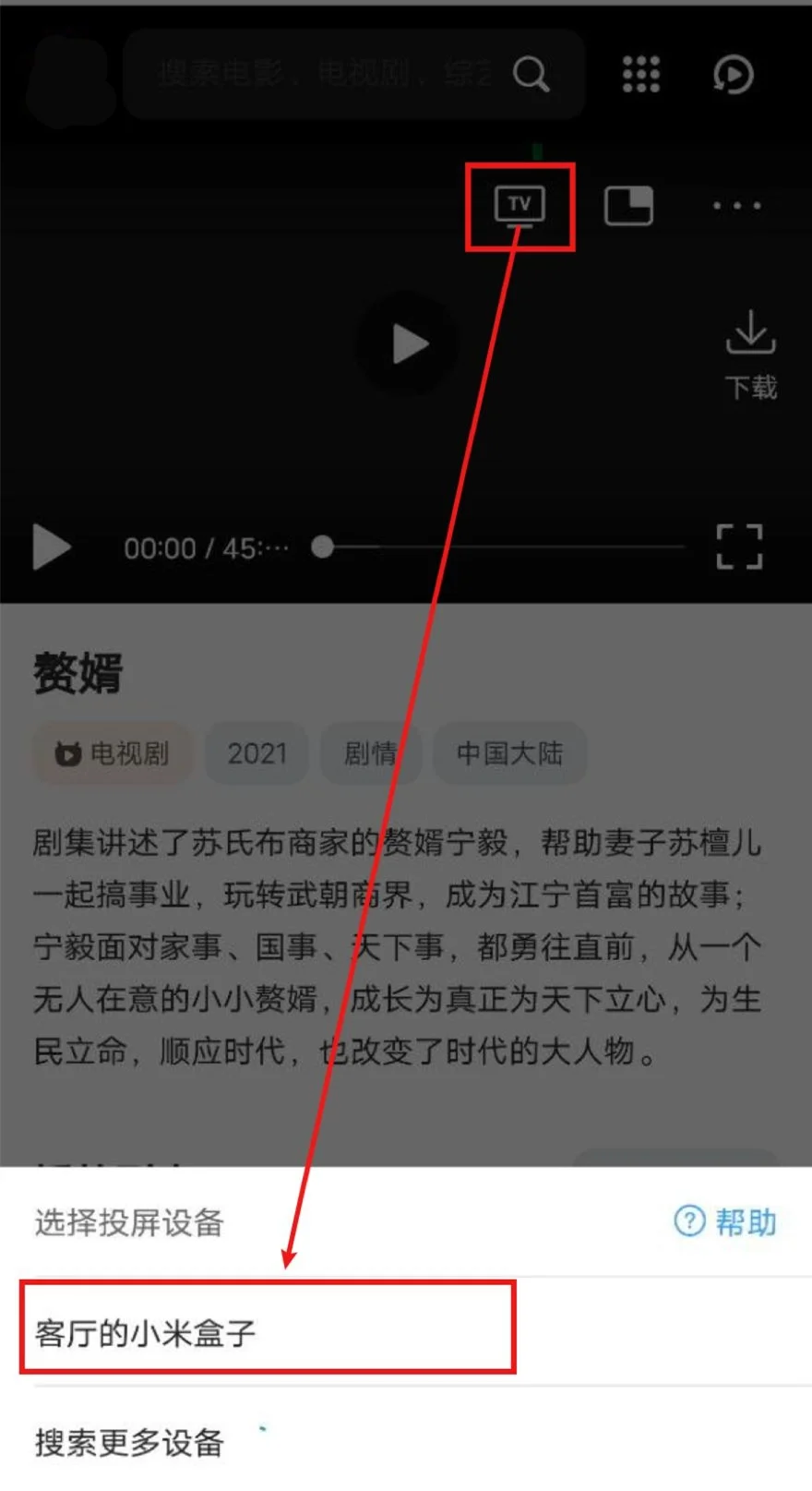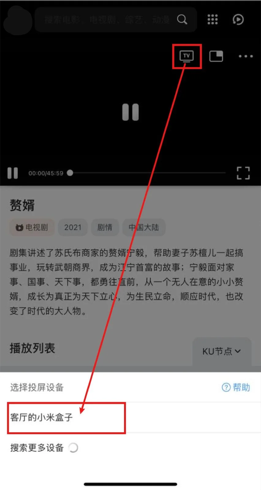 打开QQ浏览器(会接管网页播放器)->打开吾有影视->播放视频->选中投屏图标->等待搜寻出智能电视/电视盒子->选中,即可投屏。